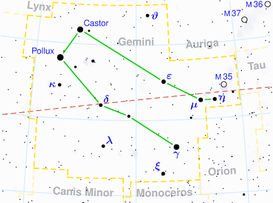 Jupiter had a couple of twin brats named Castor and Pollux although he swears that Castor was adopted. Castor is the one to the north, kicking M35 around like a soccer hooligan. M35 is your typical run of the mill open cluster of fresh-from-the-oven stars, many of them of the brighter blue persuasion. But don’t confuse M35 with NGC 2158. Don’t make that mistake. A lot of people do that because they are right there close together. NGC 2158 is also an open cluster but it is way more compact, way more distant, way more populated, and way more old. It is old enough that most of the hot blue stars have already gone kablooey. You know how those massive blue stars are, they tend to live fast and die young like James Dean.