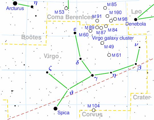 It can be tricky finding Virgo if you are not familiar with her territory, good luck trying to connect her dots. She does have one bright star, Spica (the wheat sprig), and most folks get there by hopping down from Arcturus (the bear chaser), and you get to that star by hopping down from the Big Dipper. In springtime, the Big Dip is on the very top of the sky or close to it for most of us, sorry Kangarooland. So start by looking straight up. Notice the tail has an arc. It arcs to Arcturus, a lonely red star.