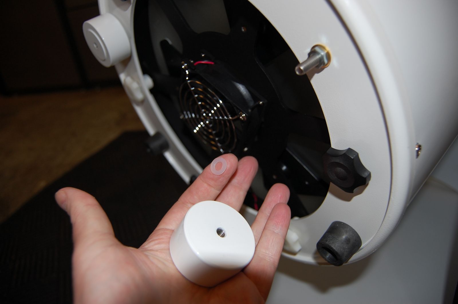 One drawback to a large eyepiece or camera is all that extra weight on the front end of the tube, unless you want to look at the trees on the horizon all night. I’m reluctant to permanently alter anything brand new and shiny, but this called for drastic action. I drilled two holes in the mirror cell and mounted bolts for adding counterweights. I have a pile of these stack-able weights but two of them, one on each stud, seem to be just right for countering heavy eyepieces, but not too much that I have to take them off when switching to lighter eyepieces. The only time I have to change them is to add more weights to counter a camera. That isn’t often since the scope doesn’t track. I can shoot the Moon, or terrestrial things, that’s about it.