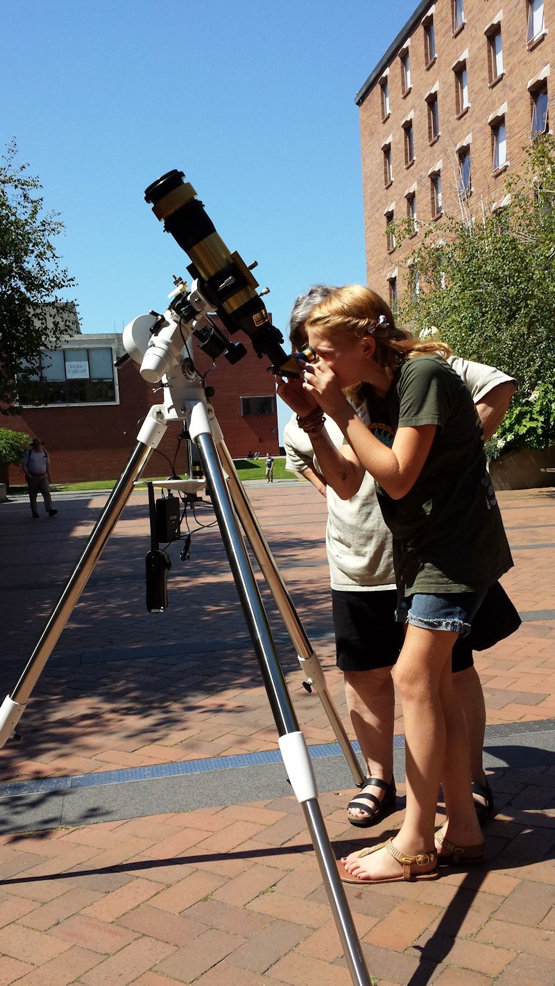 How do you aim a solar scope without looking at the sun? That’s actually an important safety question, although I must confess I removed the little sticker on the lens cap warning people not to look directly at the Sun with just their eyes. The scope is beautiful, all shiny brass and black and silver, but the sticker looked stupid. It’s on my shop fridge now. Here’s what you do. Look down at the scope’s shadow. If the scope doesn’t have a distinct shadow with sharp edges, you are wasting your time trying to view the Sun anyway so put the scope away for a less cloudy day. The trick is to move the scope around in an effort to make the shadow as small as possible. When the scope is aimed at the Sun, the shadow is small and circular. Just getting close will cause a white dot to appear on the frosted screen of the little peep scope which is mounted on top of the optical scope. That’s the little tube that says Coronado. Refine the aim by getting the white dot in the middle of the screen. Voilà, solar disk in the eyepiece.