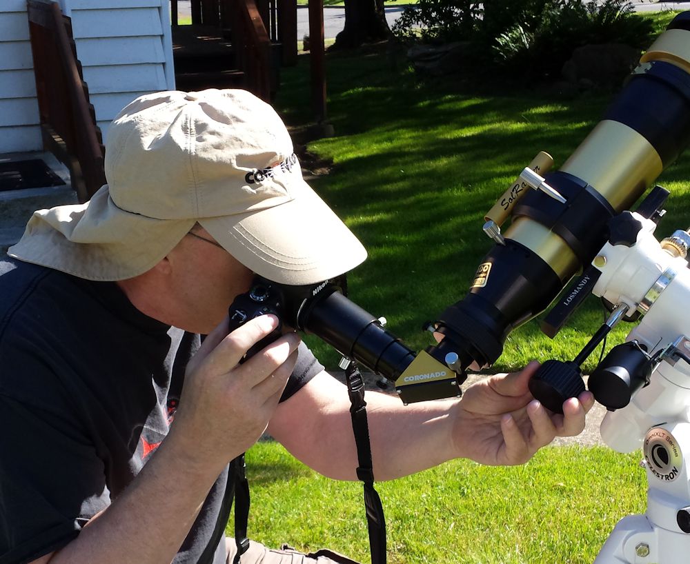 There are tricks for getting the axis of rotation of a mount lined up with the celestial pole, even though it’s daytime and you can’t find the tell-tale pattern of stars near North Star. But I rarely use these tricks for solar viewing. First of all I’ve used the scale on the side of the mount head to set the axis to my geographic latitude (48.5deg). So now I just plop the scope down in the backyard with the north leg, the one with a big “N” over it, towards my neighbor’s barn, which I know to be generally under the North Star. That alone is enough to keep tracking the Sun steady in the eyepiece for the better part of an hour. Depending on the direction of the image drift, I could give the north leg a light kick, left or right, if I wanted to. But here’s the thing. Long before the image drifts out of view, I’m messing around with eyepieces, or centering some feature I want to study, or retreating to my shop fridge to fetch a lovely beverage or something. Even if the image is out of view when I get back, it is mostly drifting along the axis of right ascension so I just push the right button on the hand-held control panel and bring it back to center. Then have another beverage.