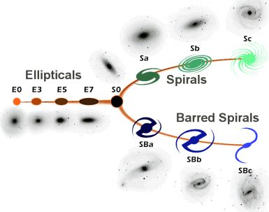 Hubble classified the various shapes into a system that is known as the “tuning fork.” He could have used a spoon or a knife or an egg beater and it would have been just as good because his reasoning was wrong anyway. He thought all galaxies started out shaped like eggs and grew into whirligigs. We now know that both the eggs and whirligigs developed simultaneously over time, did so independently, but we still use Hubble’s fork graphic sometimes because he went to all that trouble to draw it. The different types of galaxies need names and these are names so just print it out and put it on your fridge and smile and nod politely.
