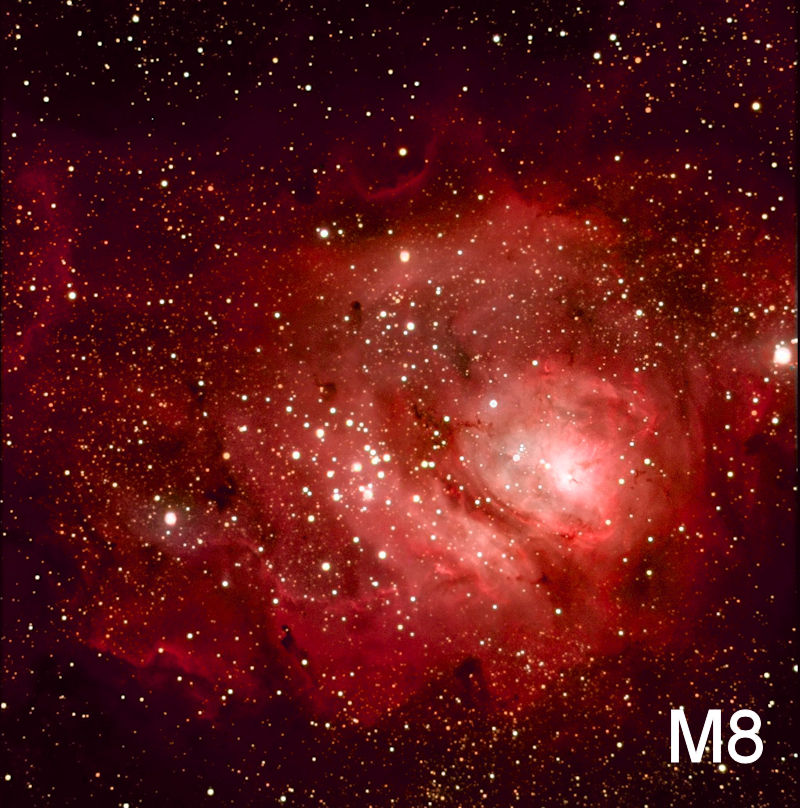 M8 is The Lagoon Nebula. In amateur telescopes it looks like an island surrounded by the black sea of space, with a swooping lagoon penetrating one side. It somewhat resembles an aerial view of Gilligan’s Island. Remember, all sorts of interesting things would wash up on the shores of the lagoon on that show, including the Harlem Globetrotters.