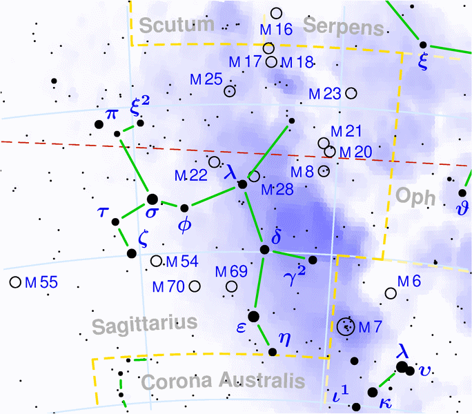 If you connect-the-dots of the brighter stars in Sagittarius it produces a teapot, the traditional short-and-stout type with an obvious handle and spout, slightly tipped over with Milky Way coming out. In addition to the bright stars there is enough tuck and fold to the crowded star fields in the background for your mind to make a decent 3D teapot out of it, provided you get out away from the city on a moonless night, relax and let your mind wander, and eat some magic mushrooms.