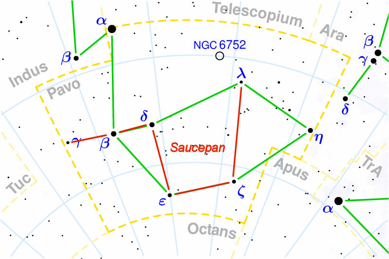 There is a group of stars in Pavo shaped like a saucepan so folks in Australia call it that, The Saucepan. Don’t confuse it with other saucepan groups like the big dipper or the one people draw in Orion. Insist on the original.