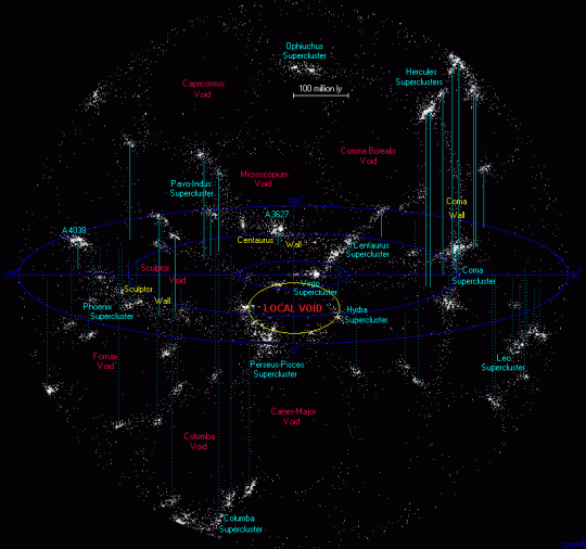 The Universe appears to be made out of shit-loads of superclusters that all overlap each other like soap bubbles. Our own bubble is called the Virgo Supercluster and it has about a hundred clusters of galaxies. But here’s the latest news. Recent observations seem to indicate that the Hydra-Centaurus Supercluster and Virgo Supercluster are both just small parts of an even bigger supercluster known as the Laniakea Supercluster. And that mega-monster of 100,000 galaxies represents one tiny little speck of the universe.