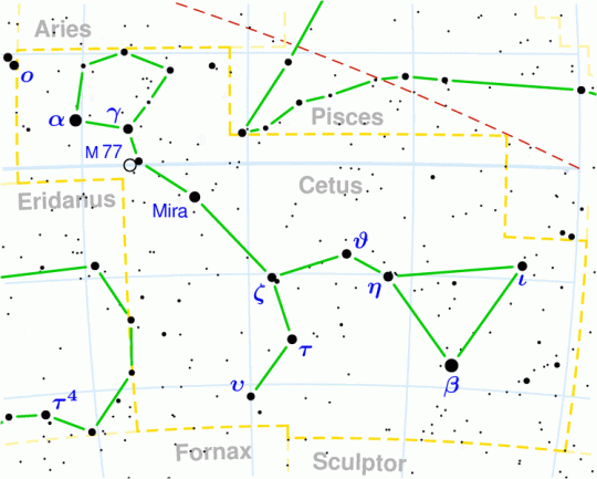 The northern border of Cetus is very close to the ecliptic, the yearly path of the Sun against the stars. It’s so close to that line, that on March 14 (more or less depending on leap year) the sun’s disk actually sticks its ass-end down into Cetus. So that’s cool. Likewise the moon and planets often wander through Cetus because the solar system isn’t perfectly flat. The asteroid Vesta was discovered in Cetus in 1807.