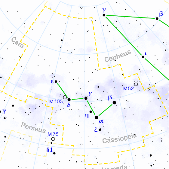 Gamma Cassiopeiae is a star that rotates very rapidly and thus bulges in the middle. A disk of escaping gas forms around it causing strong variations in the star’s brightness. The star is well known to NASA astronauts who call it “Navi,” a moniker coined by astronaut Virgil Ivan Grissom (Navi = Ivan backwards). The star has been used as a navigational reference point by space-faring astronauts.