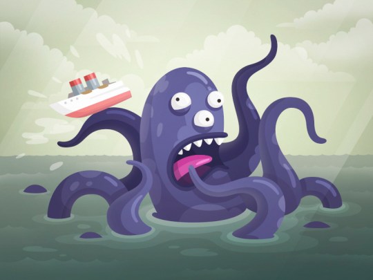 This was said, that was said, and so on until finally the Kraken got released. Cassiopeia decided that to save her town she would have to feed the lovely princess Andromeda to the hideous squiddly sea monster. That’s how things were done in those days. It paid to have a few spare daughters around. So Andromeda was chained to a rock where the Kraken couldn’t miss her, right out front by the boat docks, with a big sign that said “Take the girl, leave us alone.”