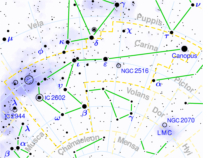 Carina is one of three constellations that make up the Argo. That’s the ship that Jason and the Argonauts used to go fetch the golden fleece. Carina is a word that means “keel” but the constellation is more than that. It’s the main body of the ship. The three parts were one constellation until 1756 when Nicolas Louis de Lacaille divided it up. That’s really for the best because if a region of a map is too big it become unmanageable, confusing, and annoying, like Alaska.