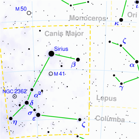 Canis Major is one of the several constellations in the sky that represent dogs. It’s the greater dog of the two near Orion. This constellation was handed down to us from Ptolemy a couple thousand years ago.