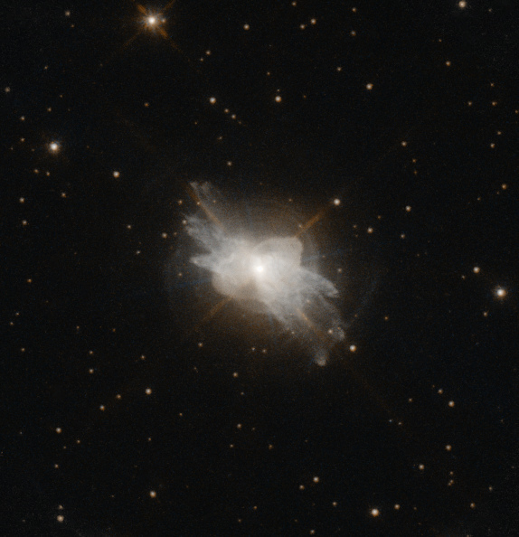 NGC 6326 is another planetary nebula. It’s in full bloom but it has an odd shape for a planetary. They usually evolve into a sort of bubble shape but then, you have to take into account that the star that belches them out is spinning differentially. It spins faster near the equator and slower near the poles. Those dynamics get baked into the cake. Also, the star is having star-quakes, which are way worse than earthquakes. On top of all that, the star may collapse and expand several times during the time it takes to peel off the layers of material that go into making the nebula. So the kitchen can get rather messy baking that cake.