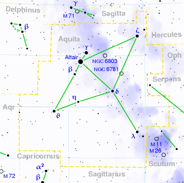 There are three bright stars in a line in Aquila, from north to south, Tarazed, Altair, and Alshain. The brightest is Altair (Arabic for eagle), which is a member of the summer triangle, some of the first stars you see as it starts to get dark on summer evenings (Altair, Vega, Deneb).