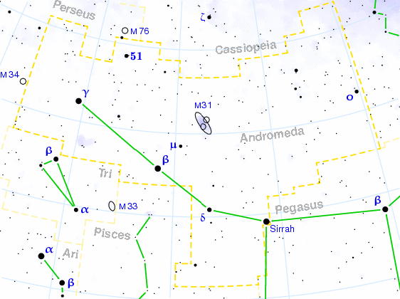 You can find M31 with the naked eye, sometimes even under city lights if the transparency of the sky is sufficient. It’s easy, start with the Great Square of Pegasus and hop towards Cassiopeia and then follow those two stars up to those other two stars and follow those up to that other star and then it’s somewhere around there.